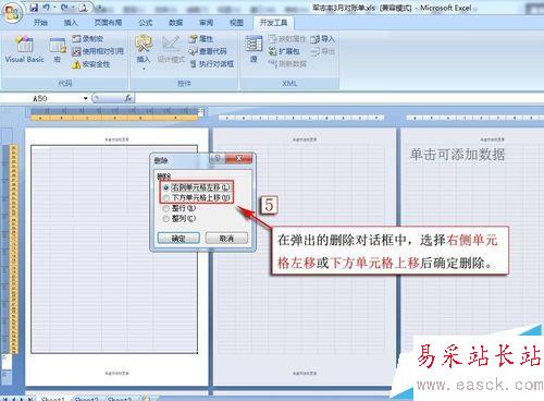 3、在彈出的刪除對話框中,選擇右側單元格左移或下方單元格上移后確定刪除。(請勿選擇正行、整列,以免刪除到數據)