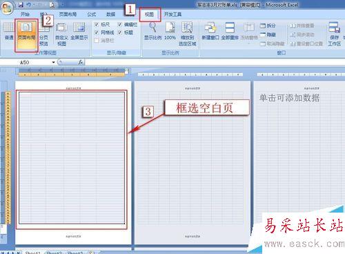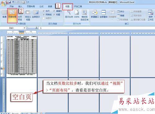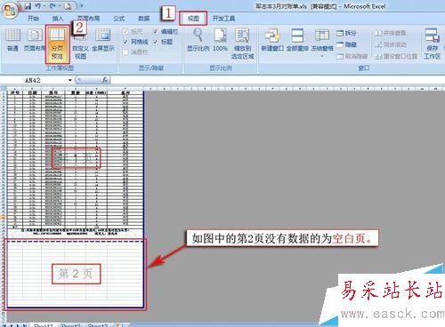 1、進入分頁瀏覽中調整分頁符,點擊“視圖”>“分頁預覽”,如圖中的第2頁沒有數據的為空白頁。