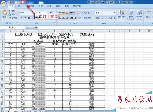 1、運行Excel 2007軟件,打開需要打印的文檔,點擊文檔左上角的打印預覽。