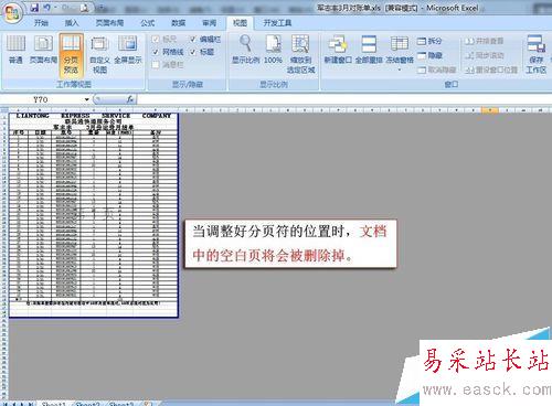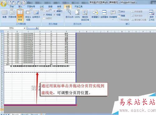 2、通過用鼠標單擊并拖動分頁符實線到虛線處,可調整分頁符位置。