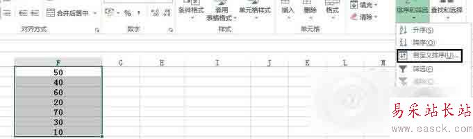 2、點“排序或篩選”, 選擇“自定義排序”。