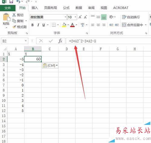 2、然后在“B2”單元格中輸入公式“=2*A2^2-3*A2-5”