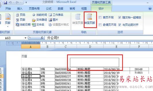 2、點擊頁眉頁腳,頁面中出現在頁眉,然后點擊轉到頁腳