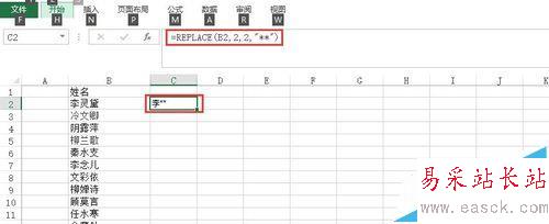 2、我們的需求,是對excel中的姓名一列進行處理,使得姓名只保留第一個字符姓,后面的名字都用*號代替,因此在C2單元格中輸入=REPLACE(B19,2,2,"**"),替換結果顯示李**。雙擊C2右下角B列所值均被替換。