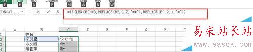 3、如果覺得名字兩個字時,不想顯示**,則可以對函數進行簡單優化,對三字和兩字進行簡單的區分即可。=IF(LEN(B2)=3,REPLACE(B2,2,2,"**"),REPLACE(B2,2,1,"*"))