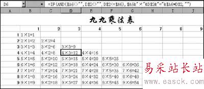 “下三角”形式是“九九乘法表”的特點之一,在我們平時使用公式時,都是通過拖動鼠標來實現的。如果這時你用鼠標來拖要小心不能拖出下三角范圍。為了防止“出格”,如出現“4×5=20”的形式,我采用了“IF( )”函數,即當A列中單元格的值在1~9之間且第1行中單元格的值在1~9之間的同時又不大于對應的A列中單元格的值(如$A6< >" ",D$2 < >" ",D$2<=$A6)時才輸出,否則輸出空格。所以公式又可改為:“=IF(AND($A6<>"",D$2<>"",D$2<=$A6),$A6&&"×"&&D$2&&"="&&$A6*D$2,"")”。現在你再用鼠標拖動,試試能否產生圖3所示的效果。
