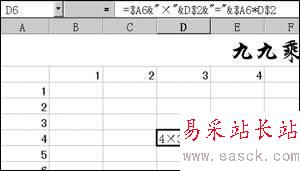 “九九乘法表”中的數值結果都是行值乘以列值而得到的,所以Excel單元格中的數值也應為行值乘以列值,如D6的值為A6乘以D2的結果,其公式為:“=A6*D2”。