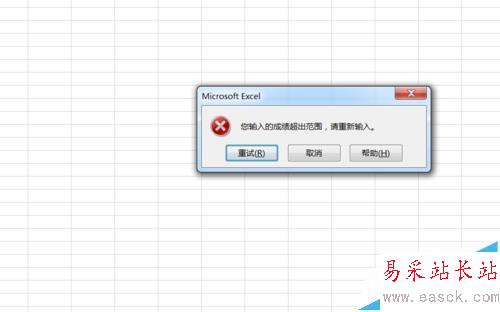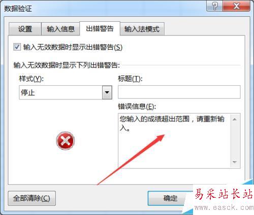 6、在出錯警告中編輯自己需要的警告,比如:您輸入的成績超出范圍,請重新輸入。