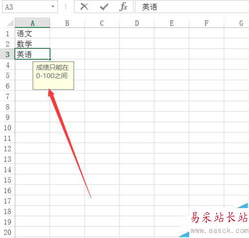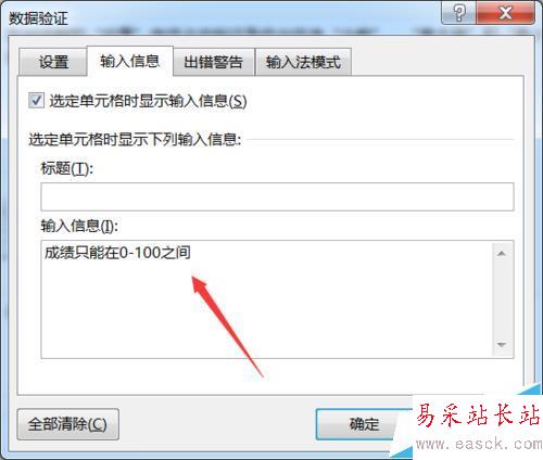 5、在“輸入信息”選項卡中輸入提示信息,比如:成績只能在0-100之間。