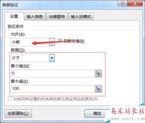 4、在對話框的“設置”選項卡中驗證條件允許選“小數”,“最大值”和“最小值”輸入要限制的數據范圍。