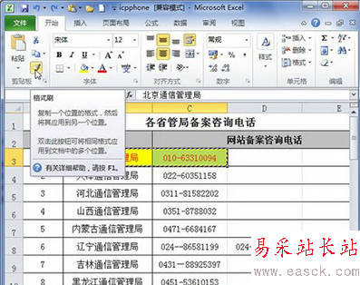 打開Excel2010工作表窗口,選中含有格式的單元格區域,然后在“開始”功能區的“剪貼板”分組中單擊“格式刷”按鈕。當鼠標指針呈現出一個加粗的+號和小刷子的組合形狀時,單擊并拖動鼠標選擇目標區域。松開鼠標后,格式將被復制到選中的目標區域,如圖1所示。