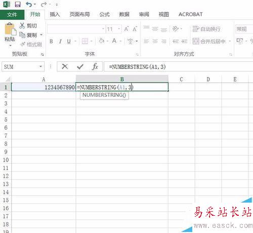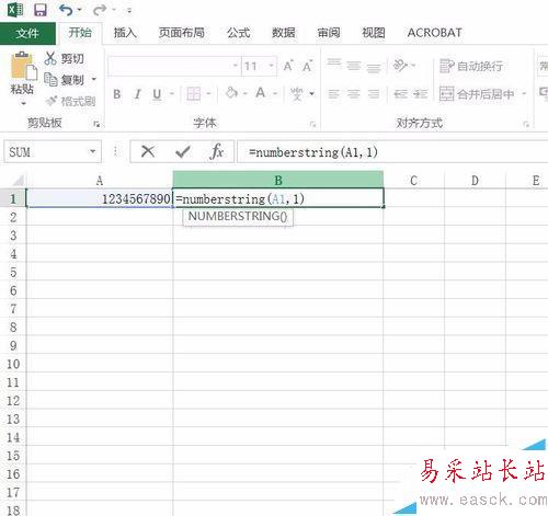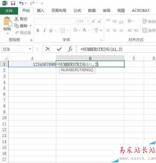 2、雙擊B2單元格,輸入=numberstring(),在括號內輸入a1,1點擊enter鍵。