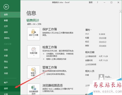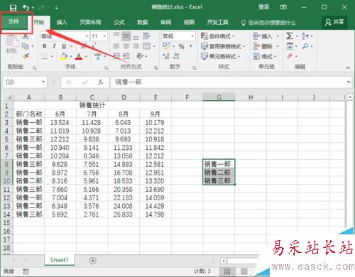 2、我們現(xiàn)在要使表格按照“銷售一部、銷售二部、銷售三部”的順序排列。在表格旁邊空白處輸入我們需要按其排序的序列,然后拖動鼠標選中這個序列,再點擊左上角“文件”按鈕,并在彈出的菜單中選擇“選項”。如圖所示;