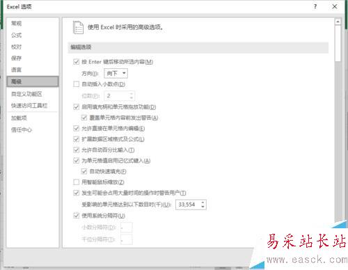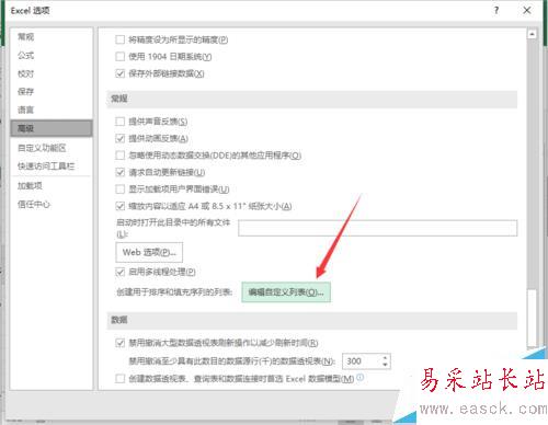 3、點擊選項后,這個時候會打開“Excel選項”對話窗口,在Excel選項對話窗口中,選擇左側(cè)窗格的“高級”選項卡,在高級選項卡右側(cè)的“常規(guī)”組中找到“編輯自定義列表”按鈕并點擊它。如圖所示;