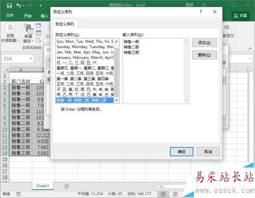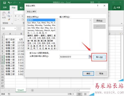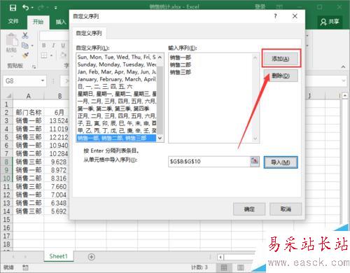 4、在彈出的“自定義序列”對話框中,首先點擊“導入”按鈕,“輸入序列”文本框中就導入進了我們需要的序列,再點擊“添加”按鈕,待“自定義序列”組中有了我們導入的序列后,單擊“確定”按鈕。如圖所示;