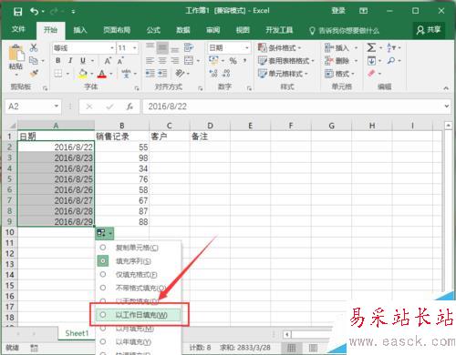 4、接著點擊填充后右下角的“自動填充選項”按鈕,在彈出的選項框中,選中“以工作日填充”選項。如圖所示;