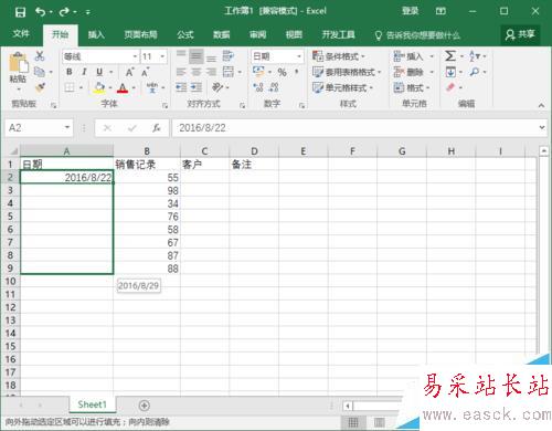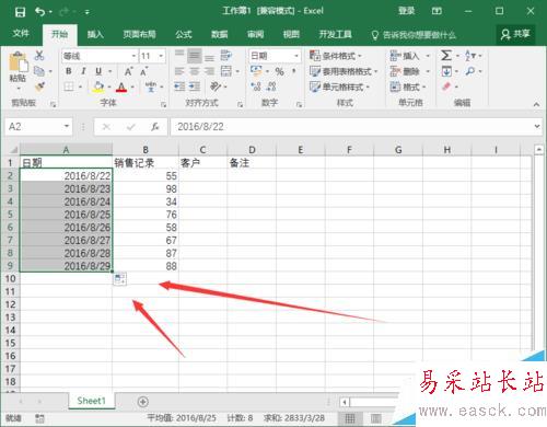 2、在打開的Excel工作薄窗口中,在A1單元格中輸入一個日期并將其選中,待鼠標變成十字,按住鼠標左鍵向下拖動至A9單元格。如圖所示;