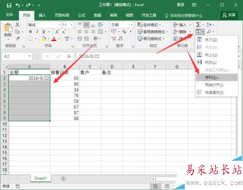 2、在打開的Excel工作薄窗口中,在A1單元格中輸入一個日期,并選中A1:A9單元格,接著依次點擊開始菜單選項卡中“編輯”功能區的“填充”選項按鈕,在彈出的選項框中選擇“序列”選項點擊它。如圖所示;