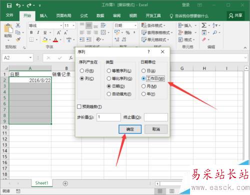 4、在“序列”選項對話框中,將“日期單位”下的選項選擇為“工作日”,再點擊“確定”按鈕。如圖所示;