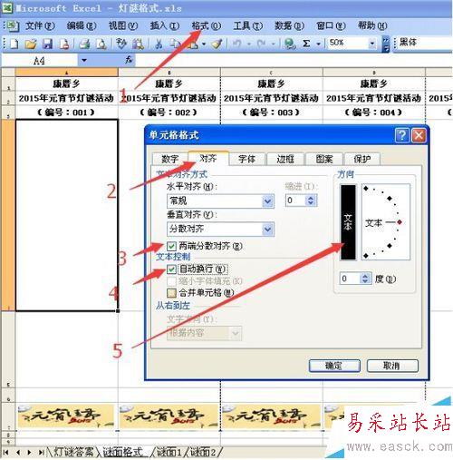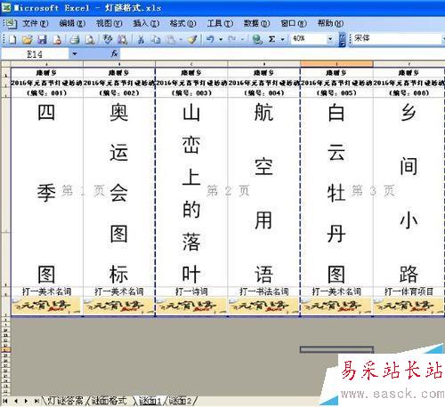 新建EXCEL工作簿,將SHEET1名稱改為燈謎答案,將SHEET2改為謎面格式。表格“燈謎答案”中包括編號、謎面、謎目、謎底四列,具體步驟比較簡單不詳述。保存工作簿,命名為“燈謎格式”