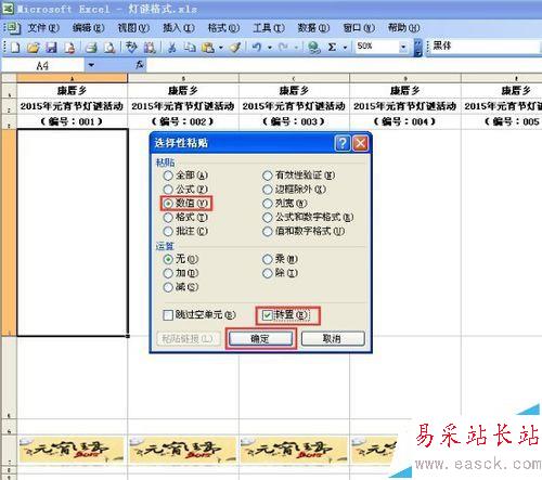 2、給表格“謎面1”添加謎面。選中表格“燈謎答案”中的B3:B22,右擊并選擇復制。選中表格“謎面1”中的A4單元格,右擊并點選“數值”和“轉置”,最后點擊確定,將復制的內容粘貼到A4:T4。