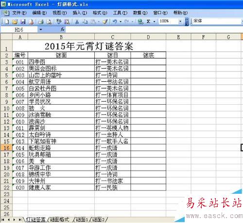 將工作薄“燈謎格式”中的SHEET2改名為“謎面格式”。