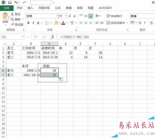 4、點擊“C6”這一單元格,并輸入“=(today()-B6)/365”。