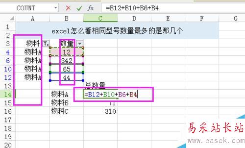 6、選中物料A之后,用sum的公式求出數據的總和,如下圖的物料A總和=B12+B10+B6+B4,具體顯示如下圖。