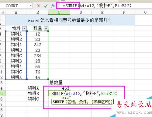7、也可以用sumif進行數據的替換。如下圖的=SUMIF(A4:A12,"物料B",B4:B12),是計算物料B的數量的。