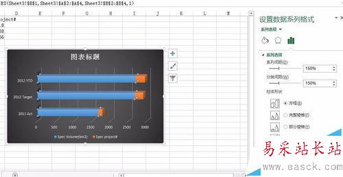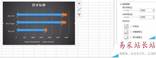 5、點擊鼠標左鍵選中條形圖,此時在右側出現“設置數據系列格式”,切換到柱形圖圖標部分,可以看到柱體形狀設置的選項;