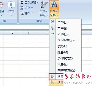 在Excel中的功能區的“開始”中找到“查找和選擇”,點擊它。