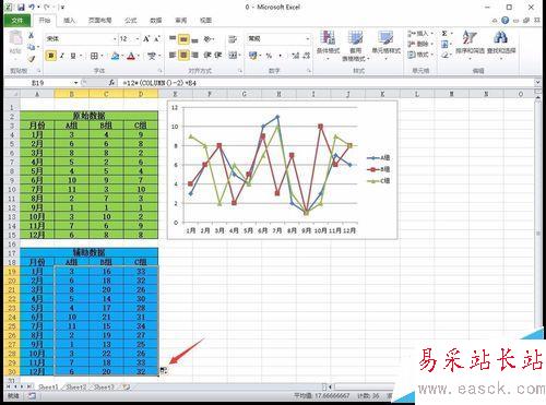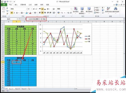 2、首先將上面的數據復制粘貼下來,并起名為“輔助數據”,然后在左上角第一個單元格中輸入“=12*(COLUMN()-2)+B4”,按回車鍵,其中12是比原始數據中最大值稍大一點的數據值,用于作為層高,B4是原始數據中對應位置的單元格。