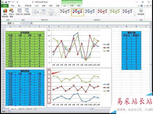 4、然后按照下圖中的方式在Excel表格中輸入三組坐標點和數據點,分別是0、3、6、9、12,3、6、9、12和3、6、9、12,數據點均為0;下面選中輔助數據,點擊“插入>折線圖>帶數據標志的折線圖”,繪制出原圖圖形,并選中其縱坐標,按“Delete”鍵刪除掉,如圖所示。