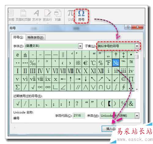 1、直接使用Excel插入該符號,不過Excel的插入不太方便,還需要進行一次復制。在excel的任意一個空白單元格插入光標。然后執行插入——符號——如圖選擇“類似字母的符號”——點選№——插入。