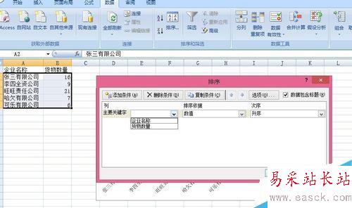 6、然后在彈出的對(duì)話框上,在“主要關(guān)鍵字”選擇“貨物數(shù)量”,排序依據(jù)“數(shù)值”,次序“升序”,然后點(diǎn)“確定”