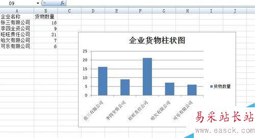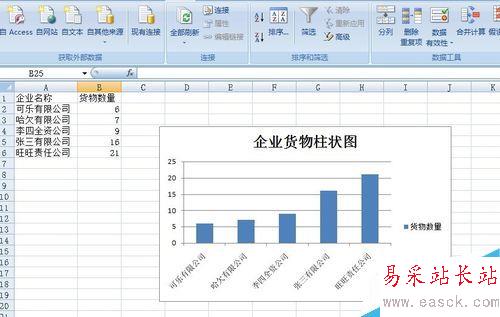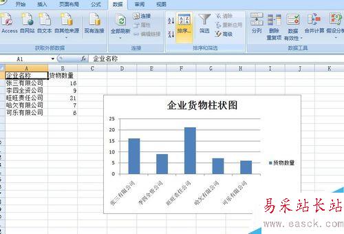 7、看到結(jié)果了吧,數(shù)據(jù)順序變成按貨物數(shù)量從小到大排序了,而且旁邊的柱狀圖的順序也相應(yīng)的調(diào)整了,大家也動(dòng)手試一試吧