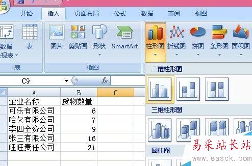 2、我們可以做一個(gè)柱狀圖來看看效果,點(diǎn)擊“插入”選項(xiàng)卡,然后選擇“柱狀圖”,選擇第一個(gè),如圖: