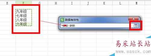 7、還有一種添加來源的方法,不用手動添加,可以使用輔助模板來選中添加。添加方法:1)首先在空白的地方編寫好內容;2)然后選中一整列;3)點擊數據有效性;4)選擇序列,選擇來源后面的小按鈕;5)然后添加選擇編寫好的內容點擊確定保存修改。