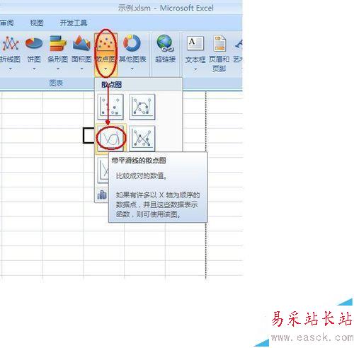 1、在功能區中選擇“插入”選項卡,在“圖表”組中依次單擊“散點圖→帶平滑線的散點圖”。