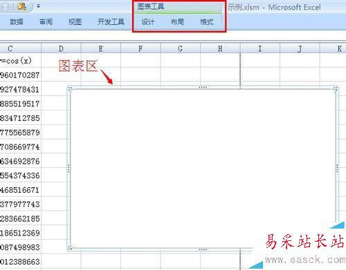 2、Excel將插入如下圖所示的圖表區,并在功能區中增加圖表工具的“設計”、“布局”“格式”選項卡。