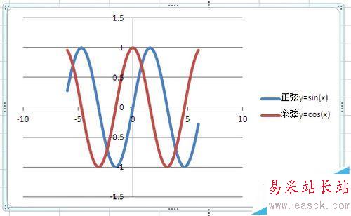 朋友們一定會遇到畫函數曲線的問題吧!如果想快速準確地繪制一條函數曲線,可以借助EXCEL的圖表功能,它能使你畫的曲線既標準又漂亮。還可以將多個函數圖像放入同一圖表中進行對比。如下圖就是在Excel中繪制的正、余弦函數圖像: