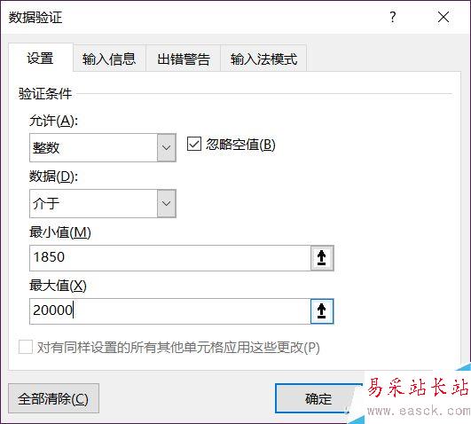 然后回到Excel表格,選中“費用”一列(不包括名稱欄)重復選擇數據驗證的操作,在彈出界面中允許部分設置為“整數”,數據選擇“介于”,填寫你了解到的費用范圍,比如最小值這里設置了1850(元),最大值設置為20000(元)。