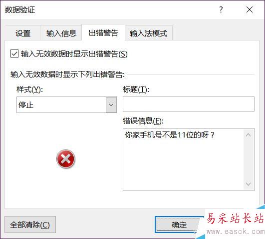 沒關系,回到數據驗證(分別選擇對應列后),切換到“出錯警告”,在錯誤信息處寫下個性化的報錯方式,一下就會顯得更加人性化了。