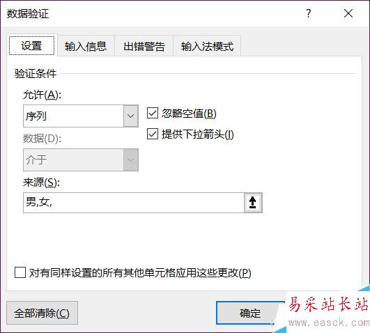 且慢,你是不是以為只能數字限制,性別處就無法設置了?當然不是,小編之所以能提出來,自然有解決辦法。老樣子先選中性別一列(不包括名稱欄),然后再允許部分選擇“序列”,來源部分寫上“男,女,”注意逗號為英文半角。另外確認“序列”右側“提供下拉箭頭”為勾選狀態。