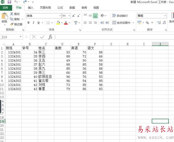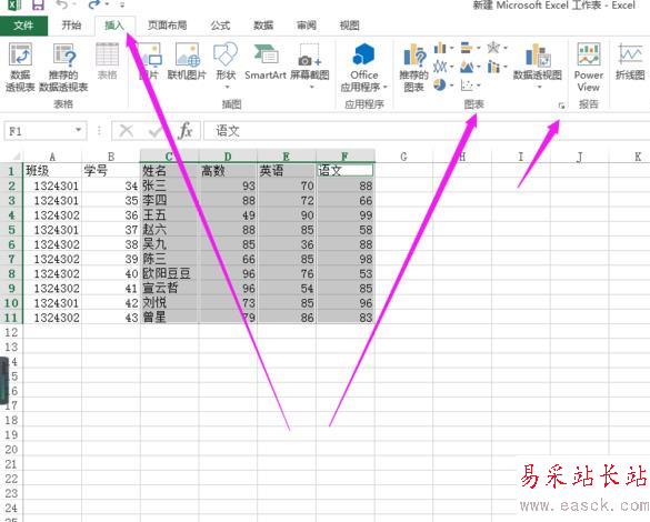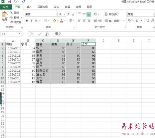 2、按住ctrl鍵,選擇你要做成圖表的數(shù)據(jù)的那一行或者那一列。比如我選擇姓名,高數(shù),英語(yǔ),語(yǔ)文這四列。