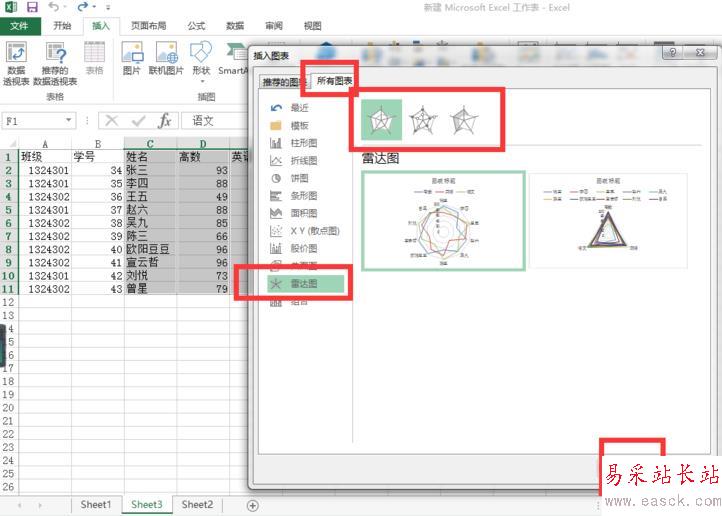 5、然后點(diǎn)擊“雷達(dá)圖”,選擇哪種帶數(shù)據(jù)標(biāo)記的雷達(dá)圖即可,之后再點(diǎn)擊“確定”。結(jié)果如圖所示。