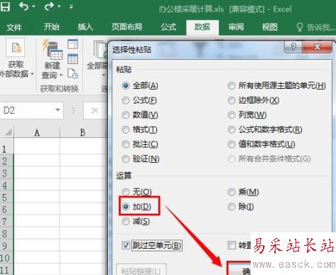 5、打開【選擇性粘貼】對話框,在對話框的【運算】欄中選擇【加】,點擊【確定】按鈕