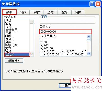 在彈出的窗口中,點擊上面【數字】按鈕,在列表中選擇【自定義】選項,然后再類型輸入框中輸入【0000-00-00】格式,點擊確定。如圖所示: