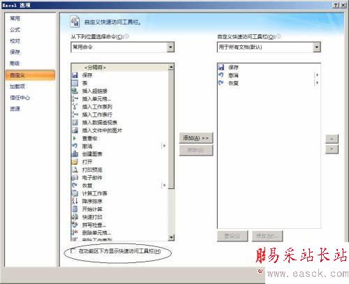 點擊左面“自定義”欄,在右面會出現“自定義快速訪問工具欄”設置界面如(圖二)所示: