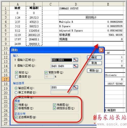 在選項卡中顯然詳細多了,注意選擇X、Y對應的數據列。“常數為零”就是指明該模型是嚴格的正比例模型,本例確實是這樣,因為在濃度為零時相應峰面積肯定為零。先前得出的回歸方程雖然擬合程度相當高,但是在x=0時,仍然有對應的數值,這顯然是一個可笑的結論。所以我們選擇“常數為零”。